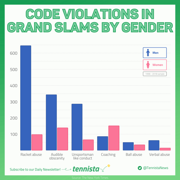 However, I call back to Serena as the only area in which women surpass code violations is unauthorized coaching. Women seem to be more guilty of receiving wrongful advice from their team, and it brings to mind of that controversial scene from the 2018 US Open in which Serena received a strong reprimand from the judge for receiving support from her coach.