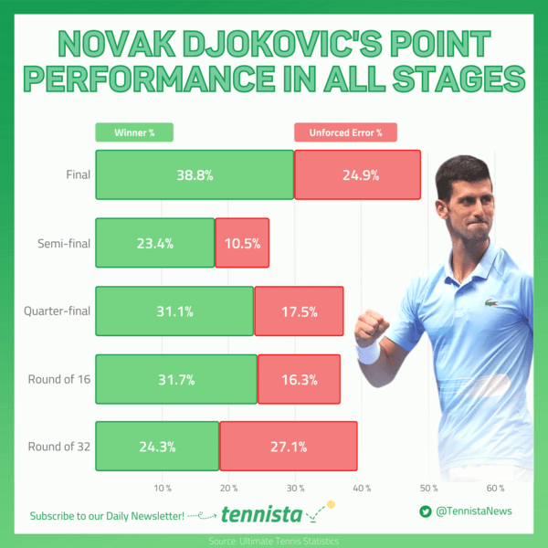 c) Finals are the full unleashed Novak show. Just look at that number of winners in championship games! It shows of Djokovic allowing his arm to blow up and affording his level of play to be displayed at its maximum.