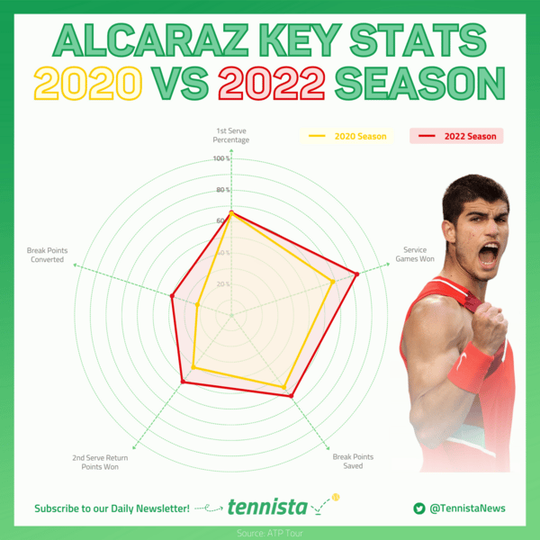 The biggest positive difference is seen in the number of Service Games Won and Break Points Converted, two of the five crucial stats for any tennis player. I think that specifically these two stats speak to the level of maturity that a player has, since they tend to be pressure situations on these types of occasions. Alcaraz has had unimaginable growth in the last two years, and his personal performance data speaks volumes.