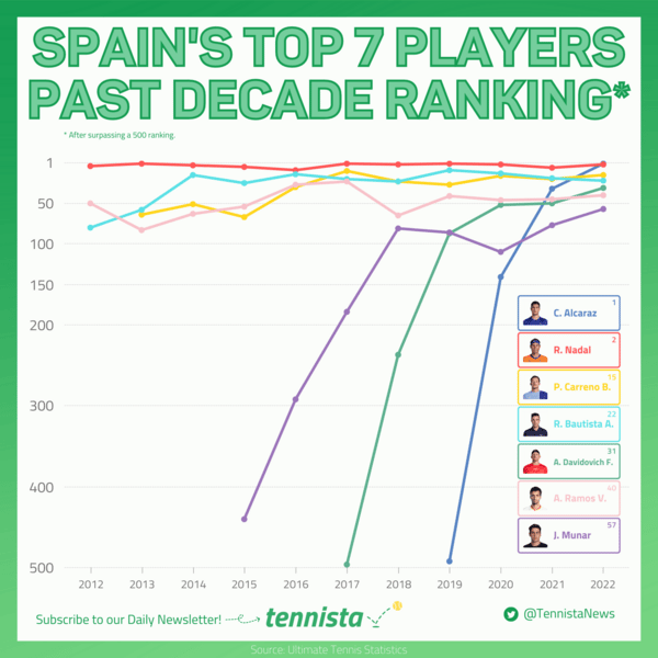 Spain is in a very interesting moment, tennistically speaking. It has the 1 & 2 of the ATP ranking with a high age contrast between Carlitos Alcaraz and Rafa Nadal. One barely building his career and the second getting closer and closer to the twilight of his. Nadal was accompanied all the way by Carreño Busta, Bautista Agut and Ramos Vinolas, constantly fighting for the first places of the second-tier level on tour.