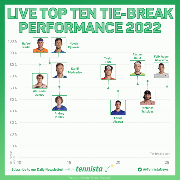 Every time I analyze statistics of the Live Top 10, I continually see that Carlos Alcaraz's numbers rarely figure in the highest positions. During 2022, the best tennis year for Carlos, he appears as the one with the worst record in tie-breaks among the best on the planet, with just under 60% of victories in this instance. Incredible that without having the top stats, he is still the absolute king of the sport.